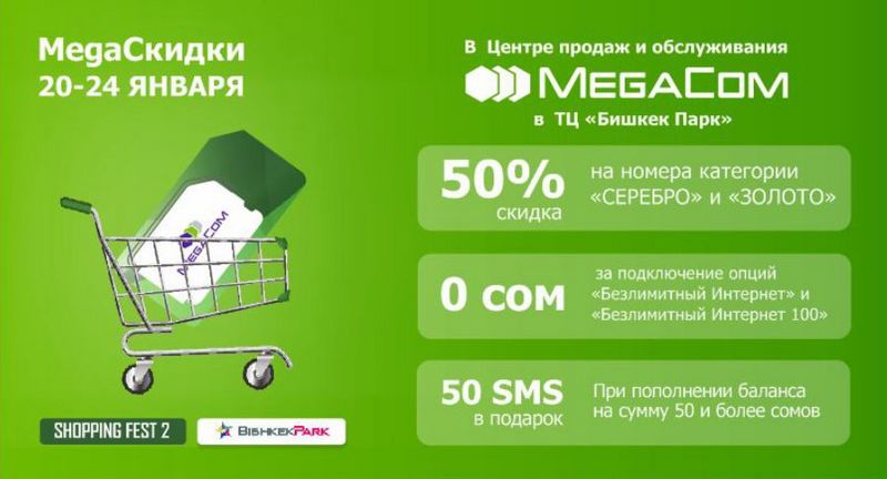 MegaCom приготовил своим абонентам приятные бонусы и сюрпризы на традиционном фестивале шопинга, который состоится с 20 по 24 января 2015 года в торгово-развлекательном центре Bishkek Park. Праздник грандиозных распродаж завершится Ночью скидок, которая пройдет с 24 по 25 января до двух часов ночи.