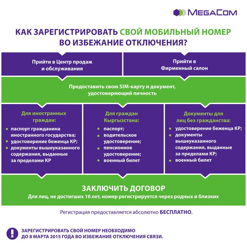 Компания MegaCom дарит бонусные пакеты бесплатных минут, SMS и мегабайты интернет-трафика «Контракт» всем индивидуальным абонентам, прошедшим процедуру регистрации номера. Совместить приятное с полезным – зарегистрировать свой номер и получить бонусы в виде бесплатных минут и SMS внутри сети, а также мегабайт интернет-трафика - можно в любом Центре продаж и обслуживания или Фирменном салоне компании. Для того чтобы заключить договор с оператором, достаточно иметь при себе документ, удостоверяющий личность: паспорт, водительские права, военный билет или пенсионное удостоверение.