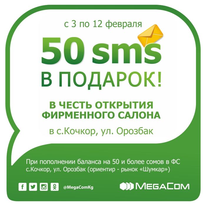 Традиционно в честь открытия фирменного салона действует специальная акция - с 3 по 12 февраля включительно абоненты, пополнившие баланс на 50 и более сомов в новом фирменном салоне MegaCom, получают 50 бесплатных SMS в сети MegaCom на 10 дней в подарок. При каждом пополнении баланса на сумму 50 сомов и более срок действия бонуса продлевается на 10 дней. Проверить состояние бонуса можно по номеру *505#.