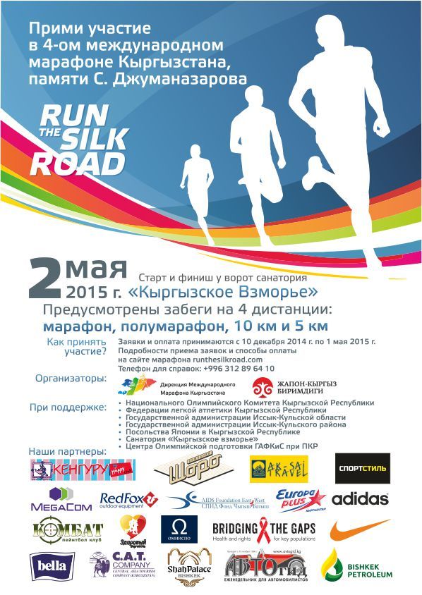 Будучи генеральным партнером олимпийского движения Кыргызстана, компания MegaCom активно поддерживает спорт и приглашает всех желающих принять участие в IV международном марафоне Run The Silk Road памяти С.Джуманазарова, который стартует 2 мая 2015 года на побережье озера Иссык-Куль, у ворот санатория «Кыргызское взморье» (с.Бостери).
