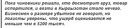 Также увеличиваются и затраты логистов: распоряжение о досмотре заставляет их оформлять транзитную декларацию из Алматы в Бишкек.