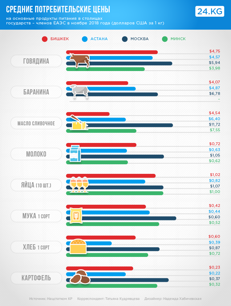 В ноябре 2018 года уровень средних потребительских цен на пастеризованное молоко по Бишкеку сложился выше, чем в столице Казахстана Астане. Кроме того, в ноябре 2018 года средние цены на хлеб из муки первого сорта по Бишкеку превысили их уровень по Астане на 35 процентов, на картофель — на 4,3 процента.