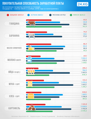 Например, на бишкекскую зарплату можно купить в 2,6 раза меньше продуктов, чем в Москве.