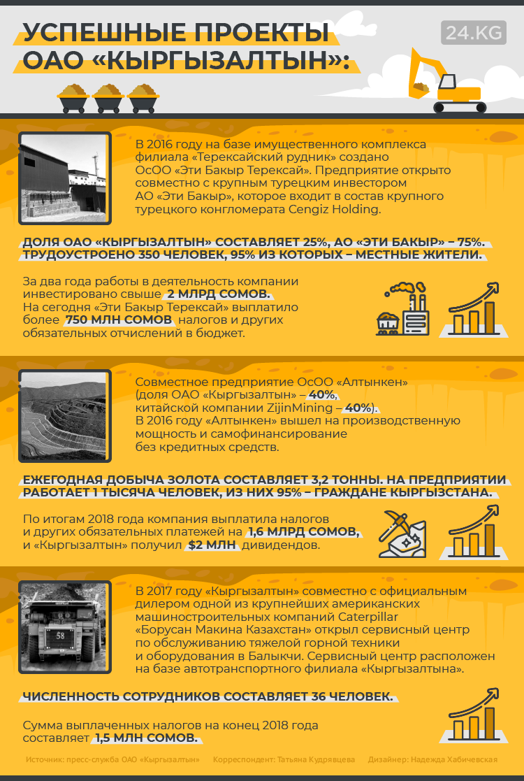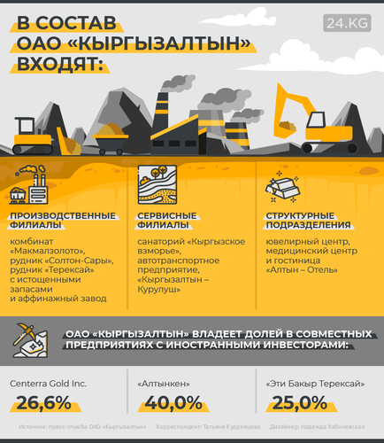 «Последние шесть лет «Кыргызалтын» всегда заканчивал год с прибылью. Она составляла от 85 до 533 миллионов сомов. При этом самостоятельно, если не учитывать дивиденды от Centerra, в 2013-2016 годах компания работала в убыток, который достигал 270 миллионов сомов. Еще в 2015 году «Кыргызалтын» испытывал большие финансовые затруднения и не мог погасить свои обязательства, имелась большая кредиторская задолженность», — рассказал председатель правления «Кыргызалтына» Алмаз Алимбеков.