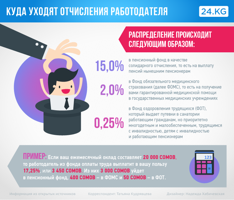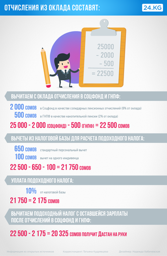 На оклад работника эти отчисления не влияют. Он остается прежним — 25 тысяч сомов.