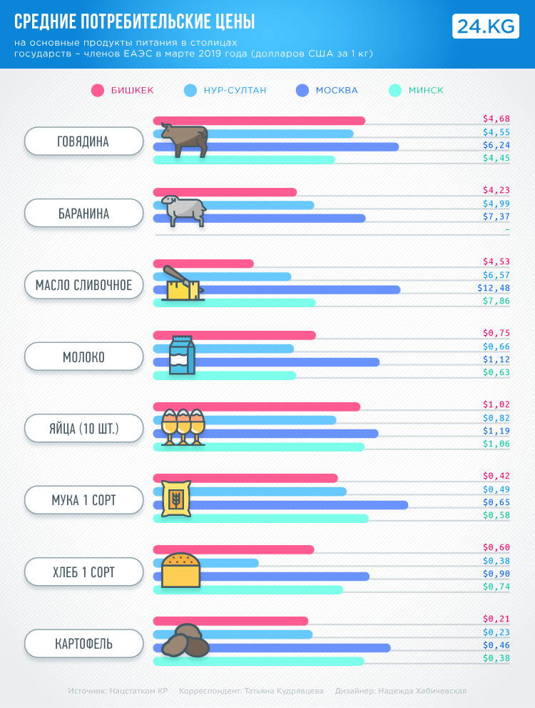 Говядина в Бишкеке дороже, чем в столицах Казахстана (на 2,8 процента) и Беларуси (на 4,9 процента). Кроме того, в марте 2019 года средние цены на хлеб из муки первого сорта в Бишкеке превысили их уровень в Нур-Султане на 36,7 процента, на яйца — на 19,6 процента.