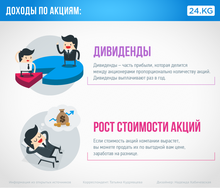 Тут все просто. Покупка акций — один из вариантов вложения денег, доступный в Кыргызстане. Покупая акции, вы можете рассчитывать на два вида дохода: дивиденды и рост стоимости акций.