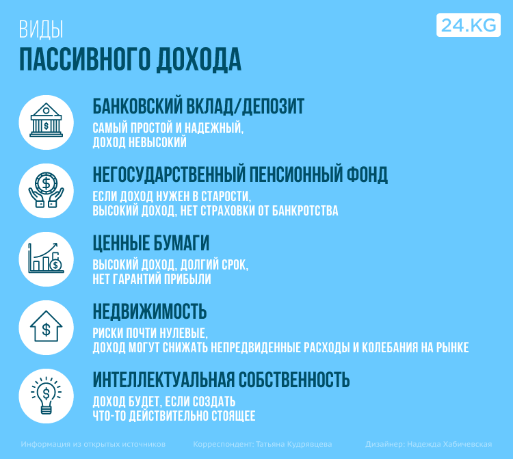 На сегодня самым простым, понятным и доступным видом пассивного дохода можно назвать депозиты. Этот вариант для тех, кто не особо разбирается в финансах, однако понимает, что просто хранить деньги невыгодно. Но заработать много вряд ли получится, ведь проценты по депозитам низкие.Если взять депозит с доходностью 10 процентов годовых для ежемесячного получения 10 тысяч сомов в виде процентов, необходимо вложить 1,2 миллиона сомов.