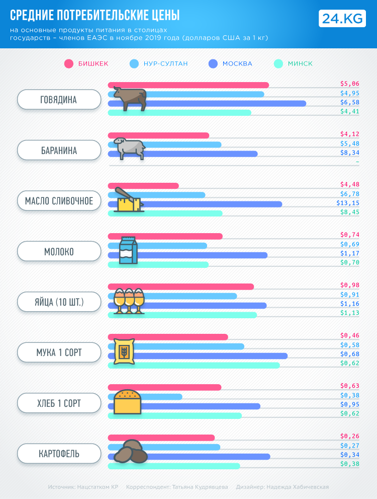 Среди столиц стран Евразийского экономического союза в Бишкеке самые низкие цены на баранину, сливочное масло, пшеничную муку и картофель. Такие данные по итогам ноября 2019-го приводит Национальный статистический комитет.