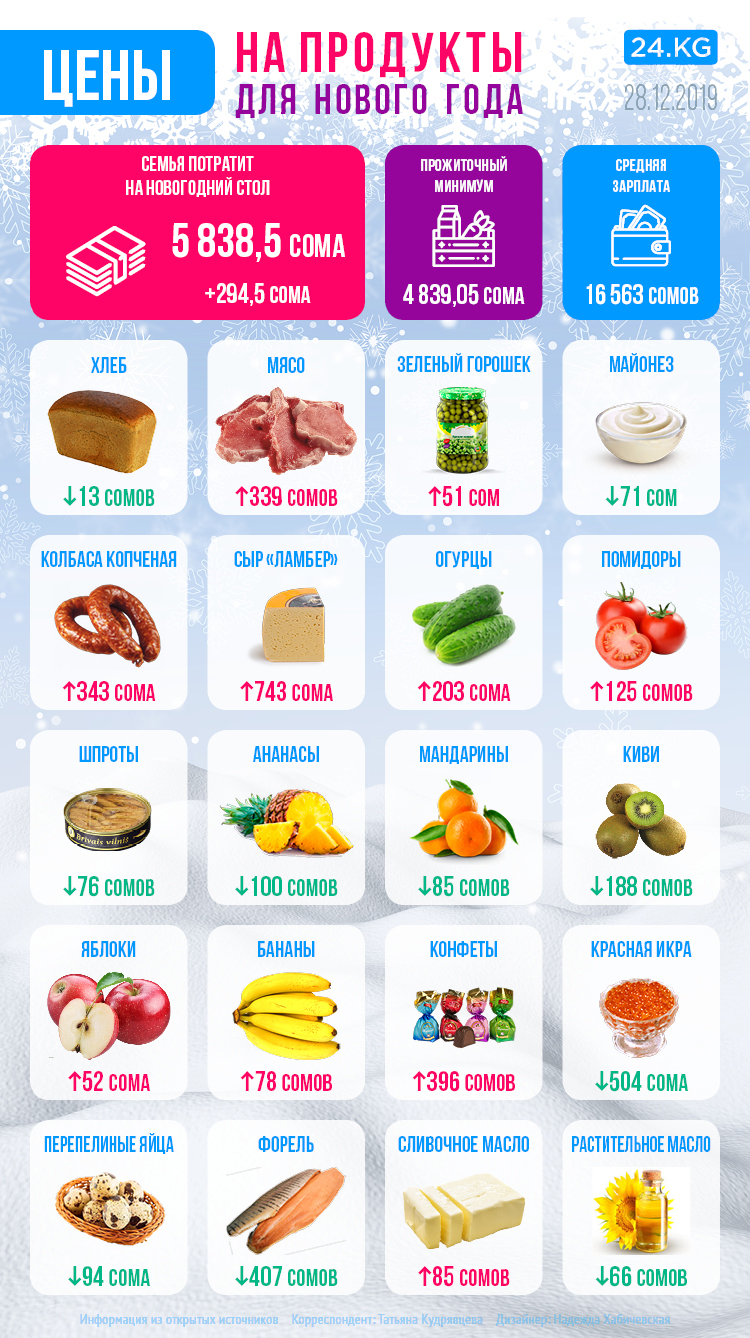 В преддверии Нового года мы немного изменили состав нашей корзины. Вместо традиционного набора продуктов наша семья будет накрывать стол к Новому году. 24-kg.com решило высчитать среднюю потребительскую новогоднюю корзину для Бишкека.