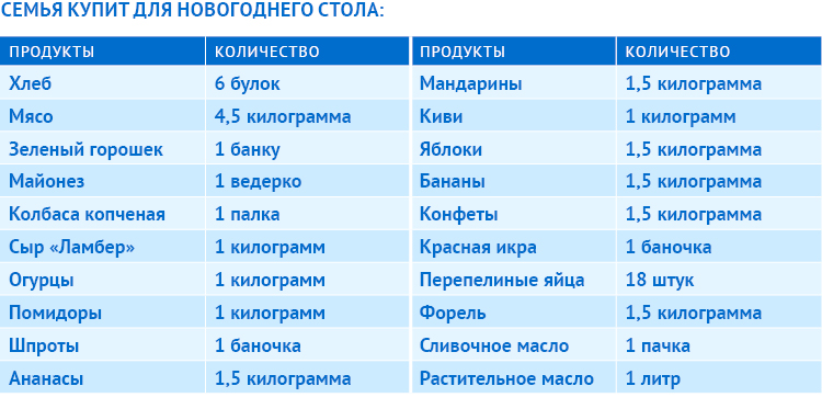 Поскольку каждая семья готовится к Новому году заранее, мы предположили, что основные продукты питания (картофель, морковь, лук, крупы) у всех в запасе есть. Найдется и баночка маринованных огурцов для оливье. Эти продукты мы в состав корзины не включали.