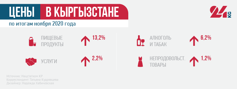 С начала года цены в Кыргызстане выросли на 7,2 процента. Максимальный рост (10 процентов) зафиксирован в Таласской области. Там же больше всего подорожали пищевые продукты и безалкогольные напитки (на 20,1 процента).