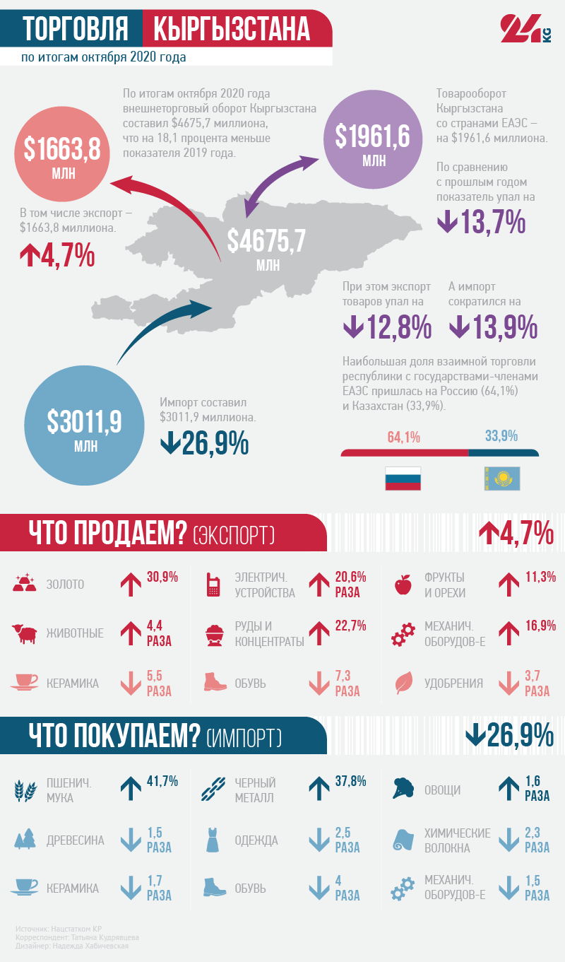 По итогам октября внешнеторговый оборот Кыргызстана составил $4 миллиарда 675,7 миллиона, что на 18,1 процента меньше показателя 2019 года. Экспорт — $1 миллиард 663,8 миллиона (рост на 4,7 процента), импорт — $3 миллиарда 11,9 миллиона (падение на 26,9 процента).