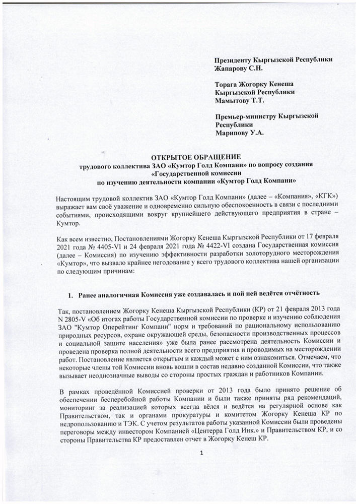 Трудовой коллектив предприятия «Кумтор Голд Компани» обратился с открытым письмом к президенту Кыргызстана Садыру Жапарову, торага Жогорку Кенеша Таланту Мамытову и премьер-министру Улукбеку Марипову.