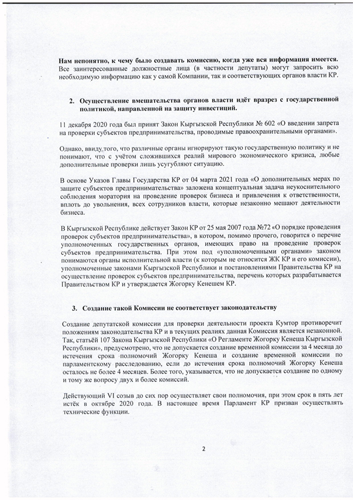 Во-вторых, представители компании считают, что вмешательство органов власти в работу компании противоречит государственной политике по защите инвестиций. «11 декабря 2020 года принят Закон «О введении запрета на проверки субъектов предпринимательства, проводимые правоохранительными органами». Однако различные органы игнорируют такую государственную политику и не понимают, что с учетом сложившихся реалий мирового экономического кризиса, любые дополнительные проверки лишь усугубляют ситуацию», — отмечено в письме.