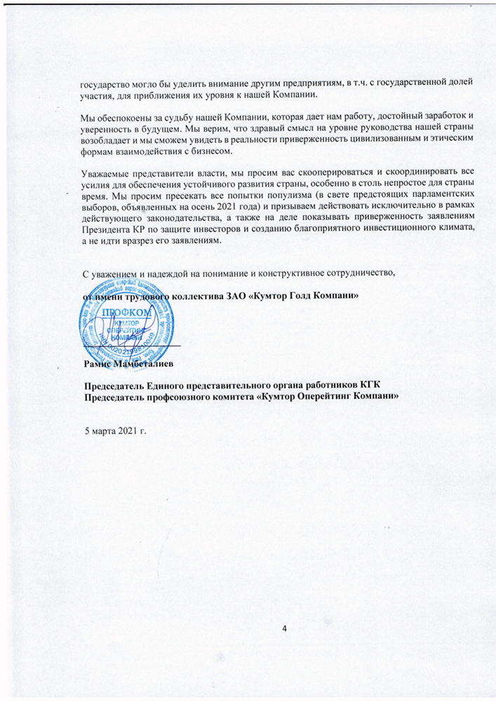 В-четвертых, сотрудники «КГК» призывают руководителей страны думать в первую очередь об экономике. «Сейчас каждый инвестор нужен стране как с точки зрения экономики, так и трудоустройства, занятости населения. Любые заявления, которые периодически звучат в парламенте, сразу влияют на внешнюю инвестиционную привлекательность страны, на стоимость акций Кыргызстана в проекте «Кумтор», и, как следствие, на доходах не только государства, но и доходах нескольких тысяч работников и их семей, занятых на данном месторождении», — говорится в письме.