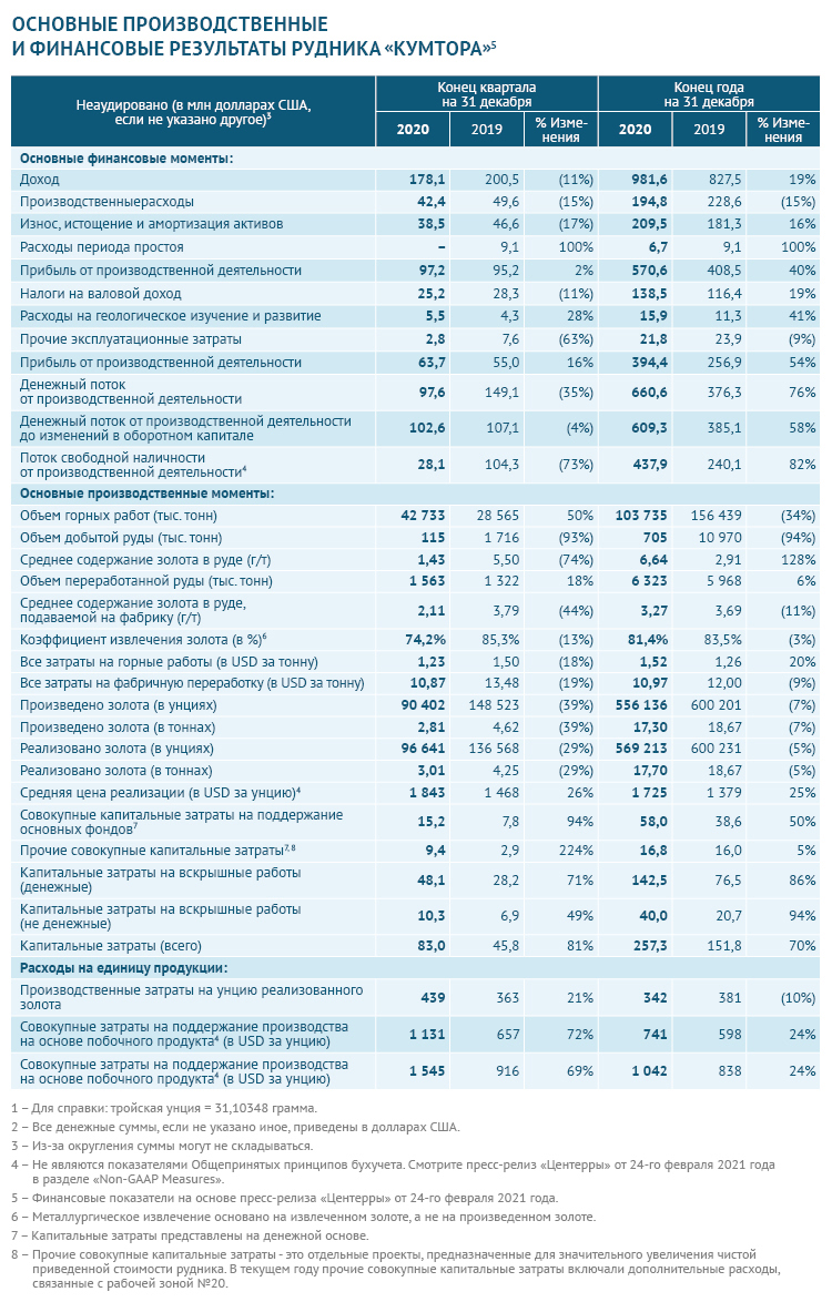 Президент и главное должностное лицо «Центерры» Скотт Перри так прокомментировал результаты четвертого квартала и 2020 года: «Для Кумтора это был еще один успешный год, в котором мы достигли верхнего предела плановых производственных показателей. Объем производства золота составил 556 тысяч 136 унций, при этом совокупные расходы на поддержание основных фондов на основе побочного продукта в перерасчете на унцию реализованной продукции составили $741, то есть меньше нижнего предела, установленного для совокупных расходов на поддержание основных фондов».
