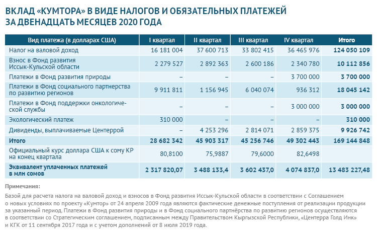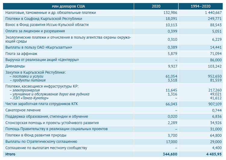 В 2020 году платежи на территории Кыргызстана (включая налоги, плату за аффинаж и местным поставщикам за товары и услуги, выплаты по инфраструктуре, благотворительность и прочее) превысили $344,68 миллиона.