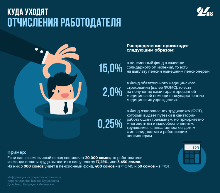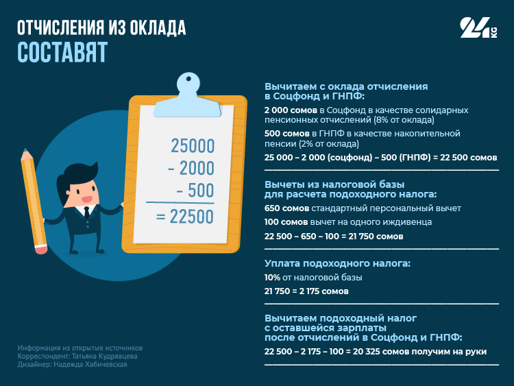 На оклад работника эти отчисления не влияют. Он остается прежним — 25 тысяч сомов.