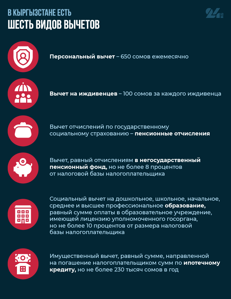Помните, что каждый кыргызстанец может пользоваться всеми видами вычетов, если он понес расходы, подпадающие под вычет. Но это не значит, что вы совсем не будете платить подоходный налог. Будете, но вычет уменьшит вашу налоговую базу, по которой исчисляется подоходный налог.