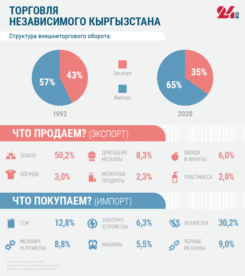 К 2000-м годам Кыргызстан стал зависимой от импорта страной с реэкспортной экономикой. Нас также стали называть надежными поставщиками дешевой рабочей силы. По официальным данным, оборот торговли по сравнению с 1991 годом вырос в два раза. В 2020 году в республике работало 342 рынка, что в 2,8 раза больше, чем в 1991-м.