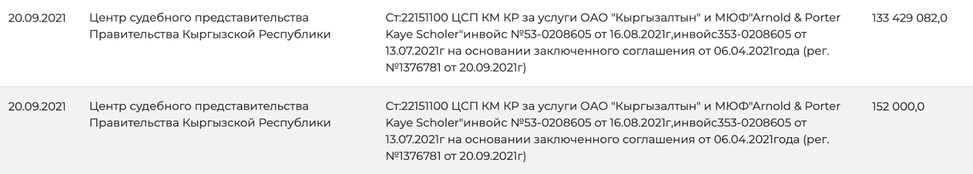 Платежи совершены в адрес ОАО «Кыргызалтын» и международной юридической фирмы Arnold & Porter Kaye Scholer согласно инвойсам от 16 августа 2021 года и 13 июля 2021 года с одинаковым номером № 53-0208605. Оба счета на оплату выписаны на основании заключенного соглашения от 6 апреля 2021 года.Напомним, что интересы Кыргызстана представляют юристы международной юридической фирмы Arnold & Porter Kaye Scholer. В разбирательстве о «реорганизационном» банкротстве «Кумтор Голд Компани» и «Кумтор Оперейтинг Компани» Кыргызстан представляет юрист Бенджамин Минц. Рассмотрение этого дела проходит в Южном окружном суде Нью-Йорка.