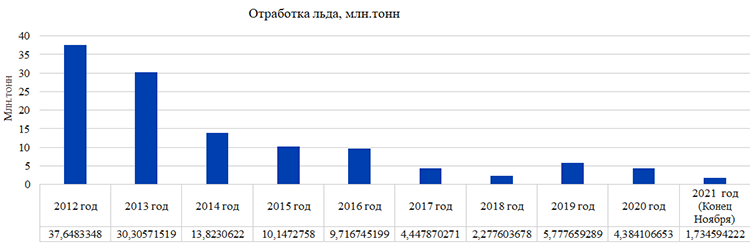 График объемов по отработке льда на руднике «Кумтор» за 2012-2021 годы: