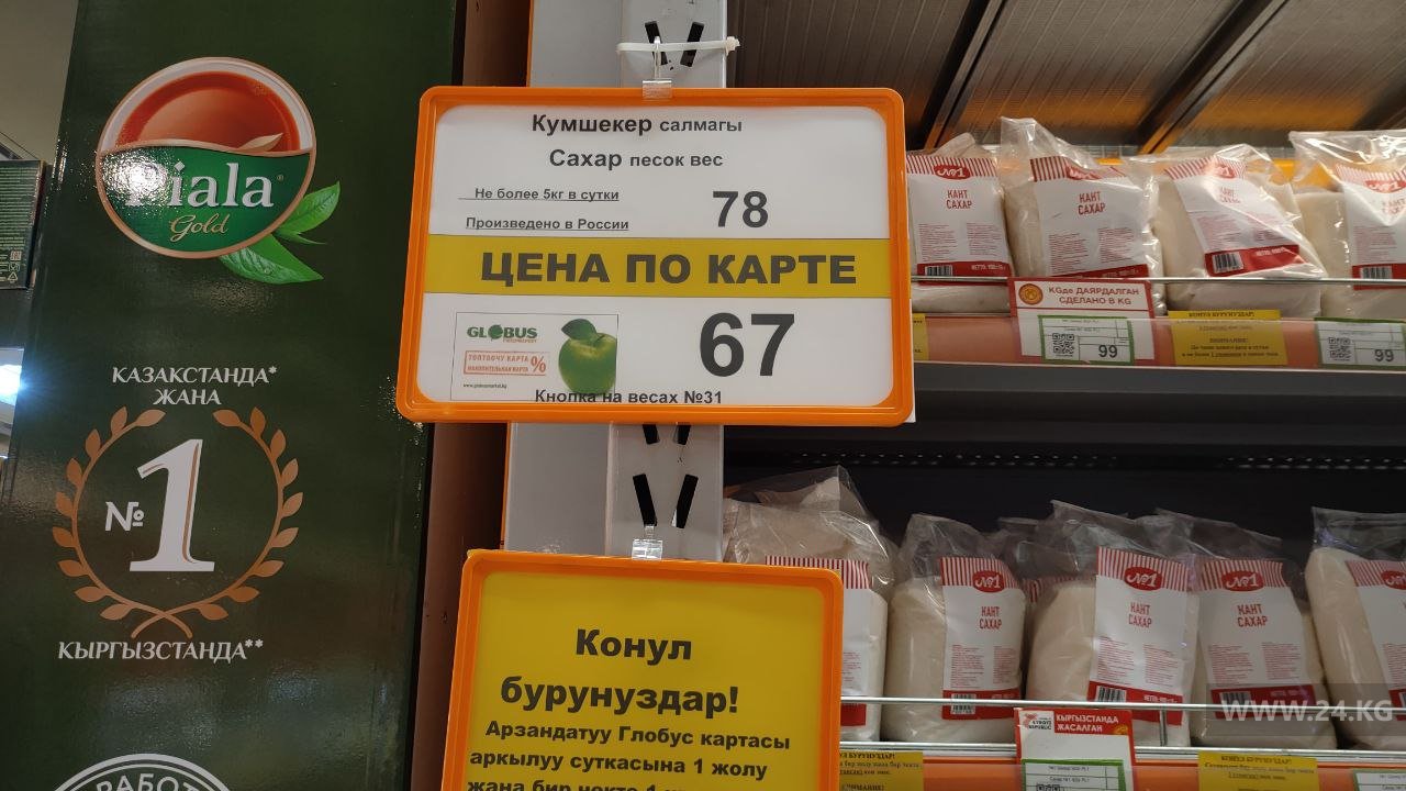 На полках в одном из центральных гипермаркетов продукты есть все, ажиотажа не наблюдается. Килограмм картофеля в магазине стоит также до 47 сомов, лука — 24-27 сомов, чеснока — 279 сомов, десяток яиц — от 69 до 145 сомов, рис лазер — 131 сом.
