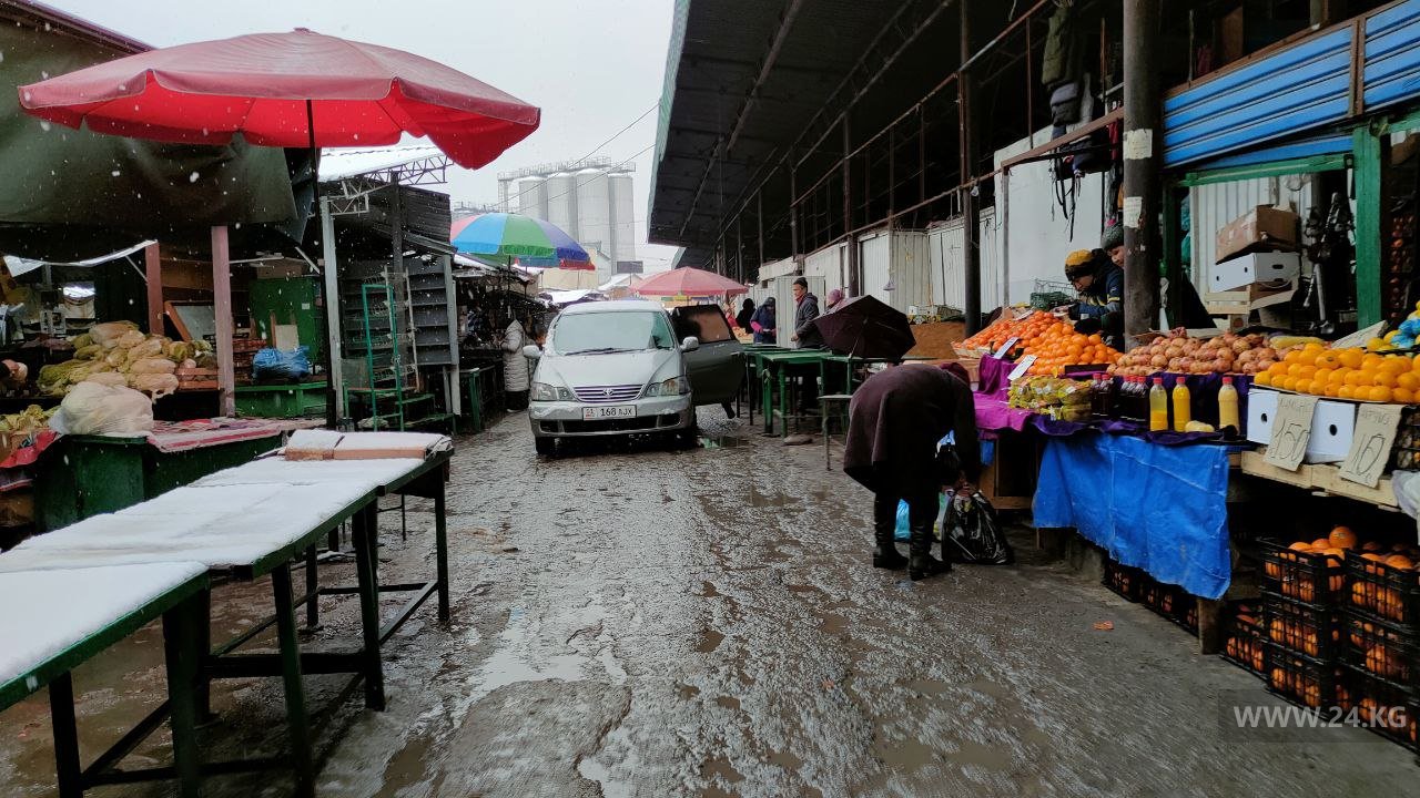 На Ошском рынке с утра людей немного. Возможно, из-за неустойчивой погоды. В основном люди покупают продукты, которые нужны каждый день: растительное масло, муку, сахар и овощи.