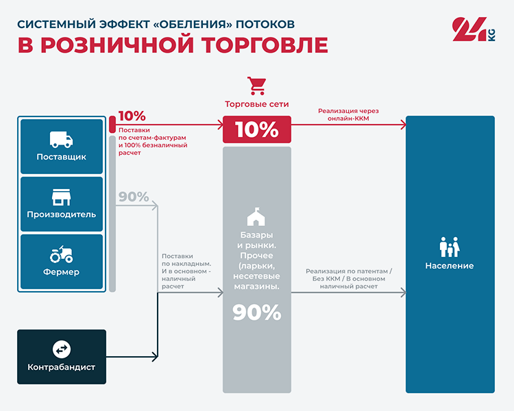 А теперь давайте вспомним походы на базар. Оплатить можно только наличкой. Кто, как и на каких условиях поставляет товары, тоже тайна. Про ККМ вообще можно не упоминать. Еще свежа в памяти кыргызстанцев провальная попытка властей заставить продавцов на рынках поставить ККМ. Все закончилось митингами и мораторием на установку аппаратов.И поправки в закон о внутренней торговле в сегодняшнем виде по сути способствует не обелению экономики, а развитию неконтролируемых оборотов на рынках. А ведь на них и сейчас приходится 90 процентов рынка розничной торговли.