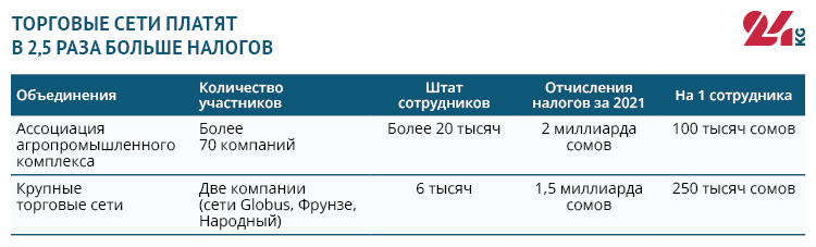 Но есть другой показатель, который хорошо демонстрирует разницу в подходах к работе двух объединений. В Ассоциации агропромышленного комплекса в 35 раз больше компаний и в три раза — сотрудников. А налогов они заплатили за 2021-й всего на полмиллиарда сомов больше, чем торговые сети.