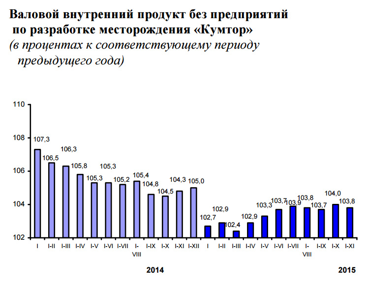 По его данным, по сравнению с 2014-м уровень ВВП вырос на 3,6 процента. Без учета предприятий по разработке месторождения Кумтор ВВП сложился в сумме 345,5 миллиарда сомов (рост - 3,8 процента).