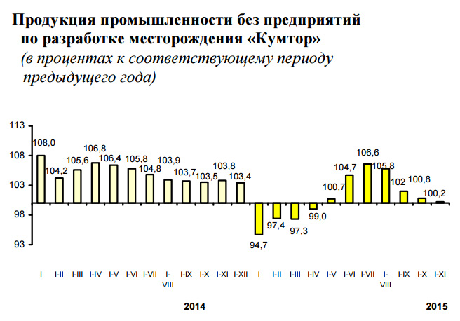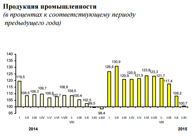 «Замедление темпов роста в промышленности в январе-ноябре 2015 года обусловлено в основном снижением производства драгоценных металлов (на 54,7 процента). Наряду с этим рост промышленного производства с начала года сохраняется в добыче металлических руд (в 5,3 раза) и производстве нефтепродуктов (в 1,9 раза). Сохраняется отставание от уровня 2014 года в текстильном производстве (на 13,3 процента), производстве одежды (на 24,8 процента), электрического оборудования (на 8,8 процента), прочих неметаллических минеральных продуктов (на 10,4 процента), электроэнергии, ее передаче и распределении (на 6,2 процента)», - комментирует Нацстатком.