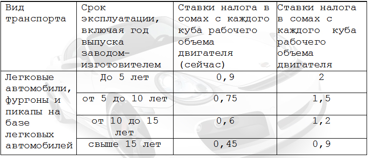 По налогу на транспорт предлагается увеличить ставки в зависимости от срока эксплуатации и года выпуска. Сейчас эта разница не превышает 0,15 сомов. В итоге ставки налога увеличатся в 1,2-2,3 раза.