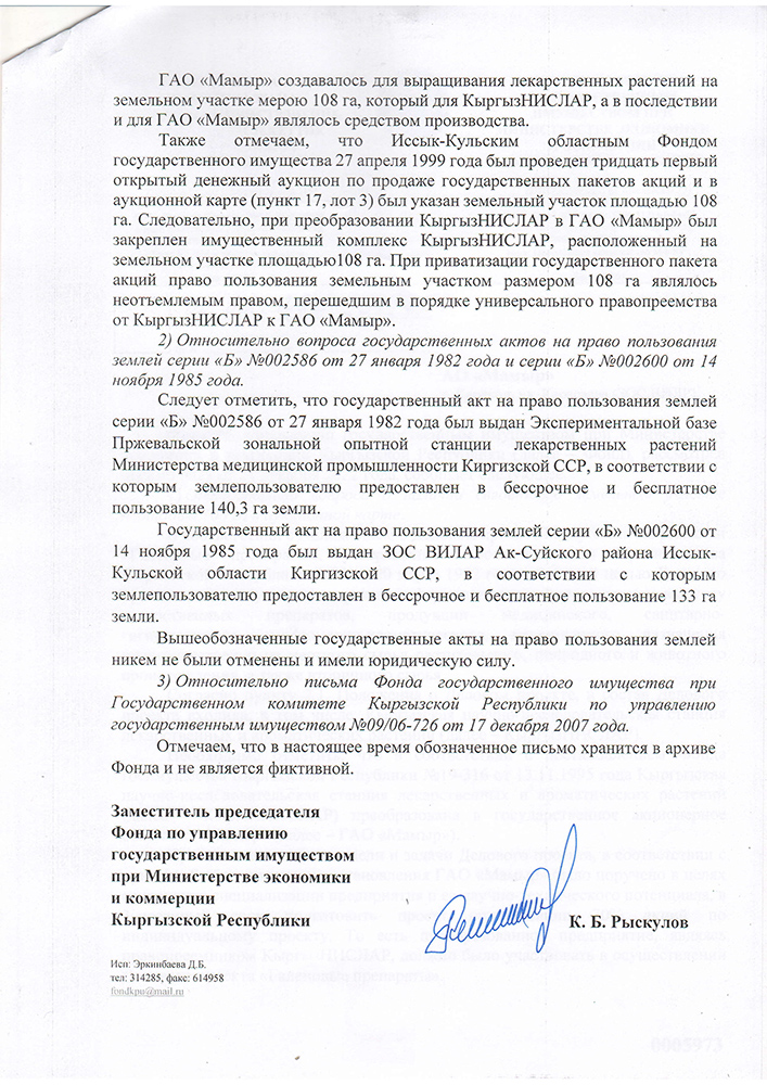 «Мы, конечно, были удивлены. Они подали в суд по вновь открывшимся обстоятельствам. Указывалось две причины. Первая — якобы письмо Фонда госимущества о том, что мы приватизировали весь имущественный комплекс на 108 гектарах, фиктивное. В «Кадастре» указали, что не смогли получить подтверждения от госоргана. Вторая причина — якобы у ОАО «Мамыр» в свое время не изъяли земли под строительство ирригационных каналов», — отмечает глава компании.