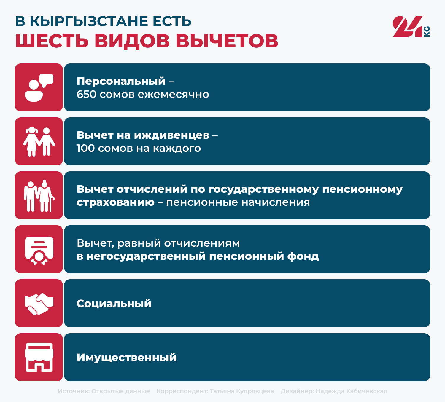 Любой ваш доход как физического лица облагается подоходным налогом в 10 процентов. Но не сразу. Сначала из ваших доходов надо отнять те деньги, которые уплатили в качестве пенсионных взносов, и вычеты. Всего в Кыргызстане шесть видов вычетов.