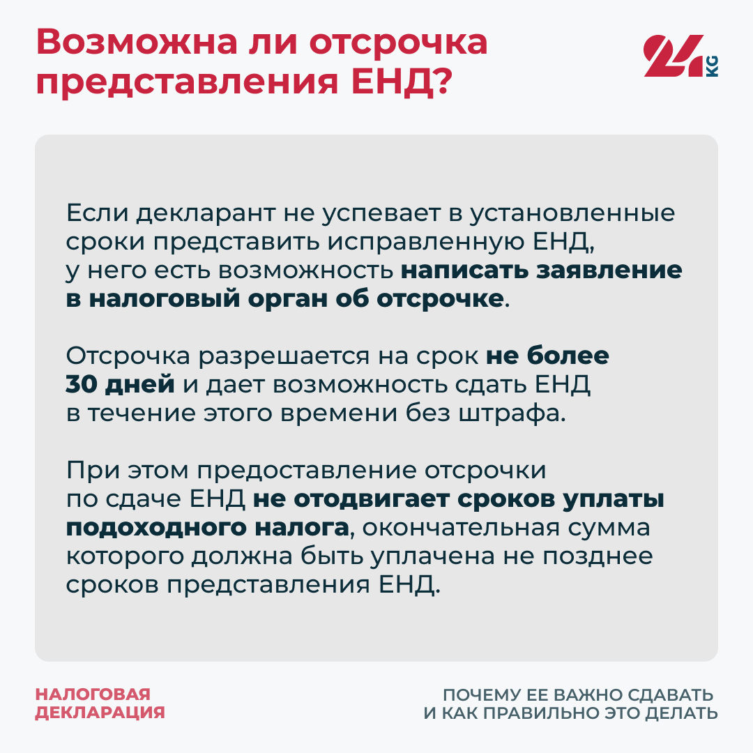 При этом предоставление отсрочки по сдаче ЕНД не отодвигает сроков уплаты подоходного налога, окончательная сумма которого должна быть уплачена не позднее сроков представления ЕНД.