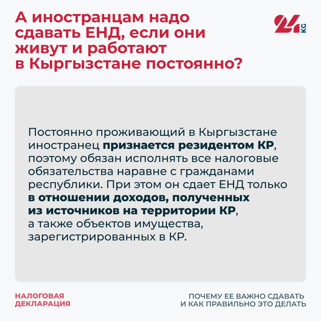 Постоянно проживающий в Кыргызстане иностранец признается резидентом КР, поэтому обязан исполнять все налоговые обязательства наравне с гражданами республики. При этом он сдает ЕНД только в отношении доходов, полученных из источников на территории КР, а также объектов имущества, зарегистрированных в КР.