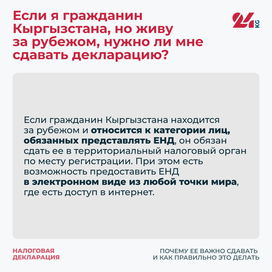 Если гражданин Кыргызстана находится за рубежом и относится к категории лиц, обязанных представлять ЕНД, он обязан сдать ее в территориальный налоговый орган по месту регистрации. При этом есть возможность предоставить ЕНД в электронном виде из любой точки мира, где есть доступ в интернет.