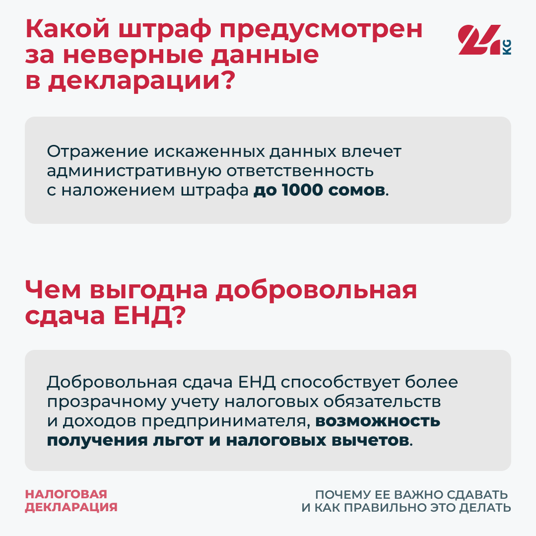 За непредставление или предоставление с опозданием ЕНД налагается административный штраф в соответствии с Кодексом о правонарушениях.Он составляет 1 тысячу сомов для физических лиц и 5 тысяч сомов — для юридических лиц.