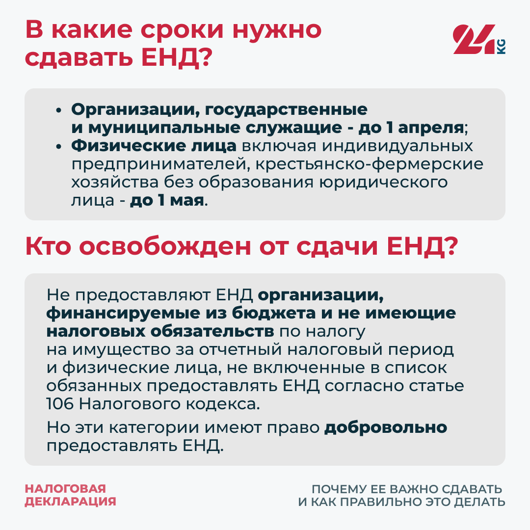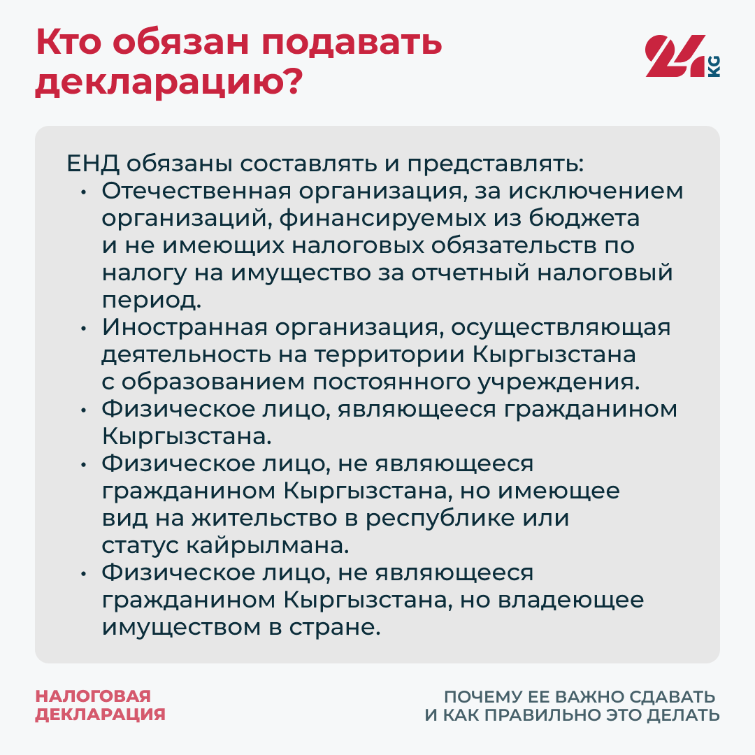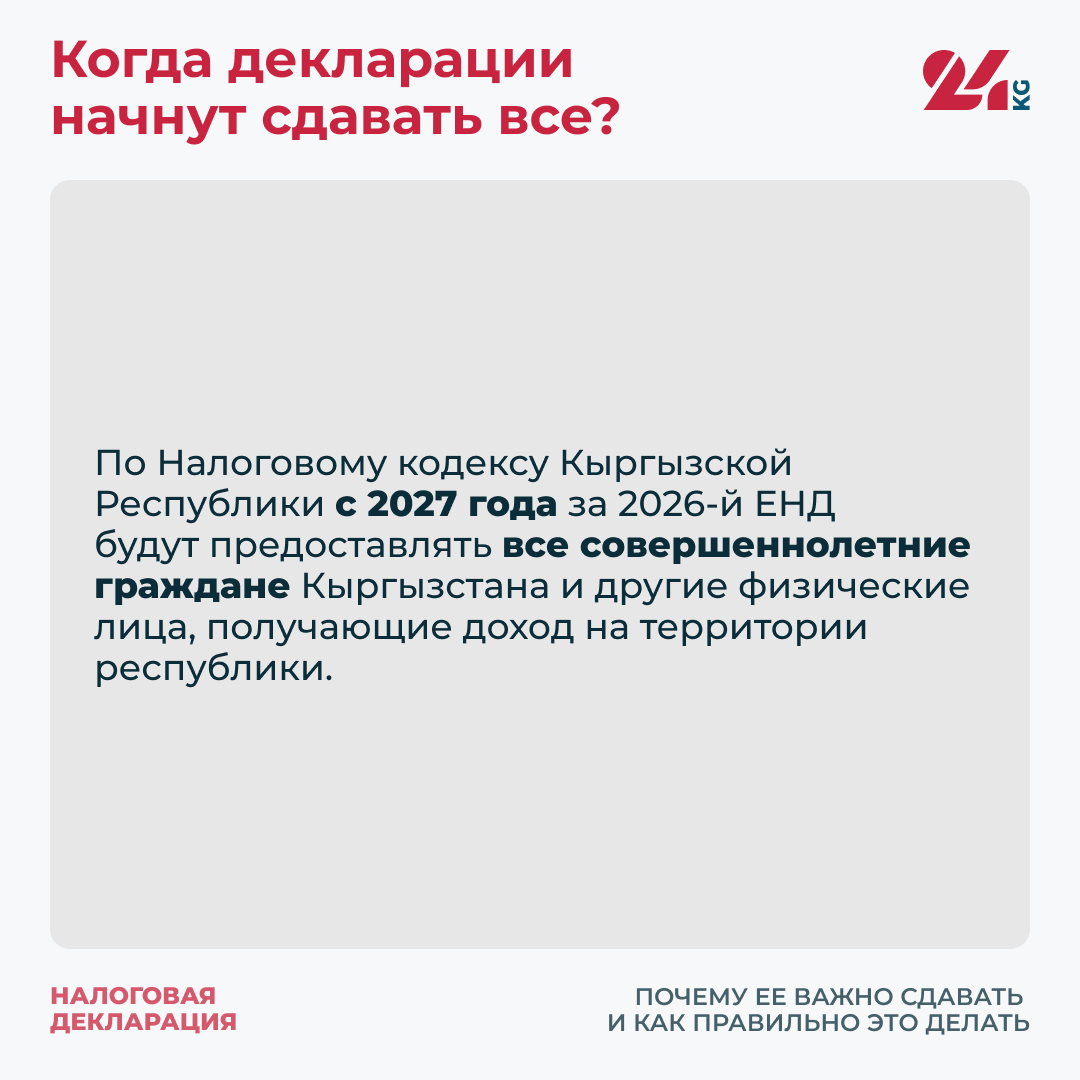 По Налоговому кодексу Кыргызской Республики с 2027 года за 2026-й ЕНД будут предоставлять все совершеннолетние граждане Кыргызстана и другие физические лица, получающие доход на территории республики.