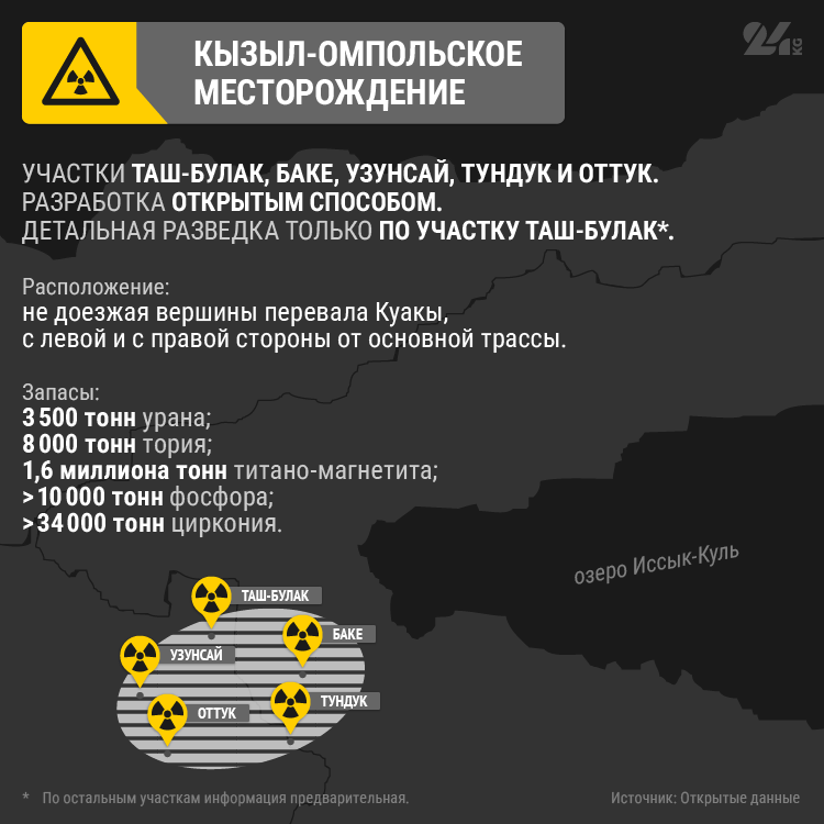 На сегодня разработка Кызыл-Омпольского месторождения невозможна на законодательном уровне. Есть два нормативных акта, которые запрещают это. С 2019 года в Кыргызстане нельзя добывать и перерабатывать уран и торий.Напомним, месторождение находится в зоне санации биосферной территории Иссык-Куля. По закону там нельзя разрабатывать никакие месторождения.