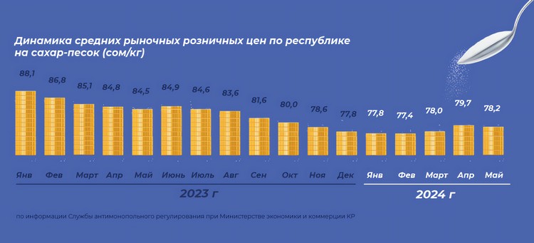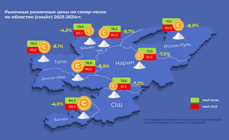 Стоимость сахара определяется на торговой бирже и зависит от цен в России, основного производителя и поставщика этого продукта на рынки стран ЕАЭС. На сегодня оптово-отпускная цена на свекловичный сахар-песок заводов ОАО «Каинды-Кант» и ОАО «Кошой» составляет 72 сома за килограмм.