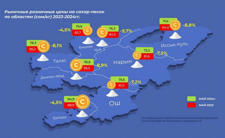 «В связи с запретом экспорта со стороны России и Казахстана есть риски вымывания сахара из КР в третьи государства. Служба считает, что целесообразно ввести запрет на экспорт сахара из нашей страны. Такое предложение мы направили в Министерство экономики», — прокомментировали введение запрета в Службе антимонопольного регулирования.