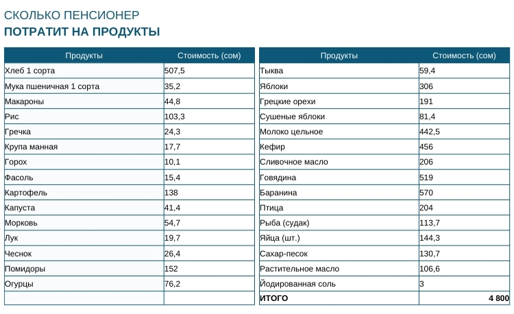 В итоге получилось, что пенсионеру необходимо 4 тысячи 800 сомов на еду, вместо заявленных 4 тысяч 526 сомов. Если прибавить 2 тысячи сомов на коммунальные услуги, то фактически у него не остается денег на лекарства и мыломоющие средства. В случае, когда пенсионер решит сначала оплатить коммунальные услуги и приобрести лекарства, на продукты останется всего 3 тысячи 600 сомов.
