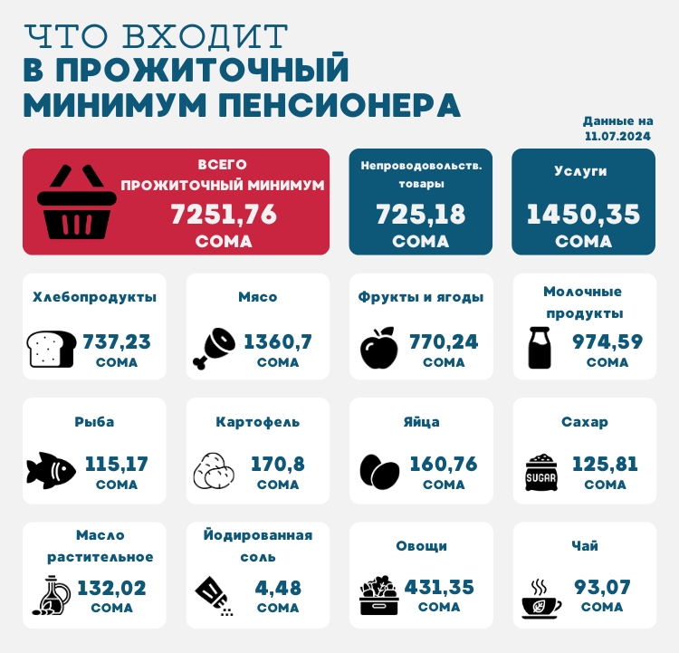 Редакция проанализировала основные расходы пенсионеров, включив в них оплату коммунальных услуг, продукты питания и траты на лекарства, основываясь на новой минимальной пенсии в 6 тысяч 900 сомов.По итогам второго квартала 2024 года прожиточный минимум в Кыргызстане для трудоспособного населения составил 8 тысяч 144 сома. Для пенсионеров показатель ниже - 7 тысяч 251 сом. Сумма учитывает не только расходы на продукты, но и затраты на услуги и непродовольственные товары. Даже с повышением пенсии до 6 тысяч 900 сомов с 1 октября она все равно останется ниже прожиточного минимума на 351 сом.