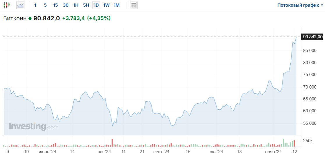 Биткоин бьет рекорды: курс превысил $90 тысяч