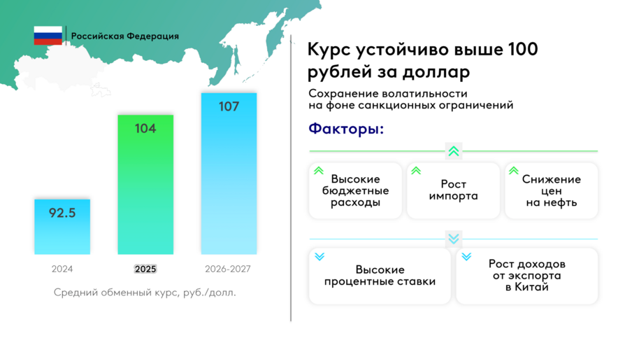 По прогнозам, в среднесрочной перспективе рубль будет постепенно ослабевать. Средний курс российской валюты в 2025-м ожидается в диапазоне 98-102 рубля за доллар. В первом квартале прогнозируется укрепление до 95 рублей за доллар с последующим ослаблением до 105-110 рублей к концу года.