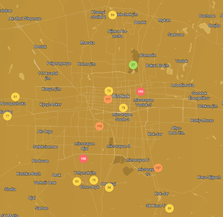 Индекс качества воздуха (AQI) разделен на шесть категорий, указывающих на возрастающий уровень опасности для здоровья. Значение AQI выше 300 — это опасное качество воздуха, а значение ниже 50 — хорошее.Добавим, что недавно Бишкек стал лидером по загрязнению воздуха в мире. Ранее министр природы Медер Машиев заявил, что в городе смога стало меньше. По его словам, основные причины смога — это отсутствие катализаторов у 85 процентов автомобилей в стране, увеличение количества жилмассивов вокруг столицы, хаотичное, неплановое строительство и вырубка деревьев.