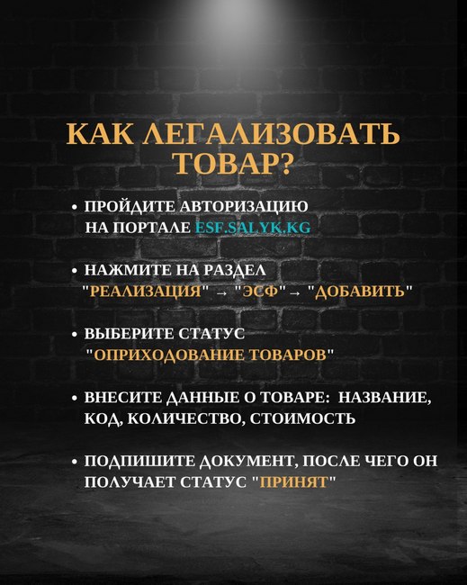 Для подачи ЭСФ необходимо авторизоваться на портале esf.salyk.kg, выбрать в разделе «Реализация» подраздел «ЭСФ», нажать «Добавить» и выбрать статус «Оприходование товаров».